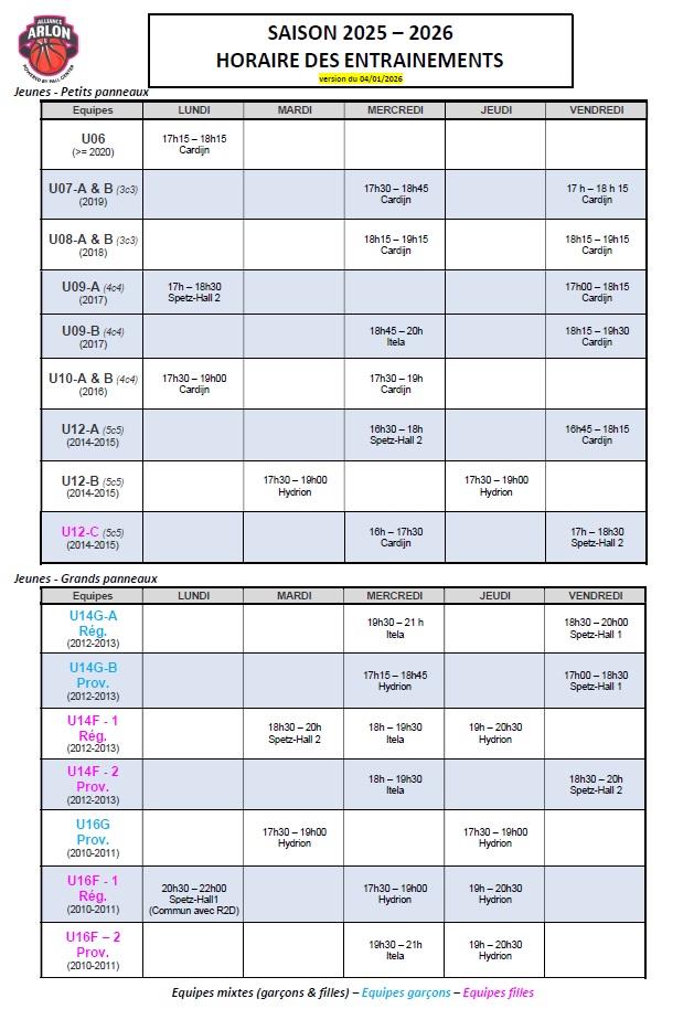 Cliquez ici pour ouvrir le tableau en version pdf reprenant tous les horaires de nos entraînements pour la saison 2025-2026. Ces horaires sont effectifs a partir du 04 janvier 2026.