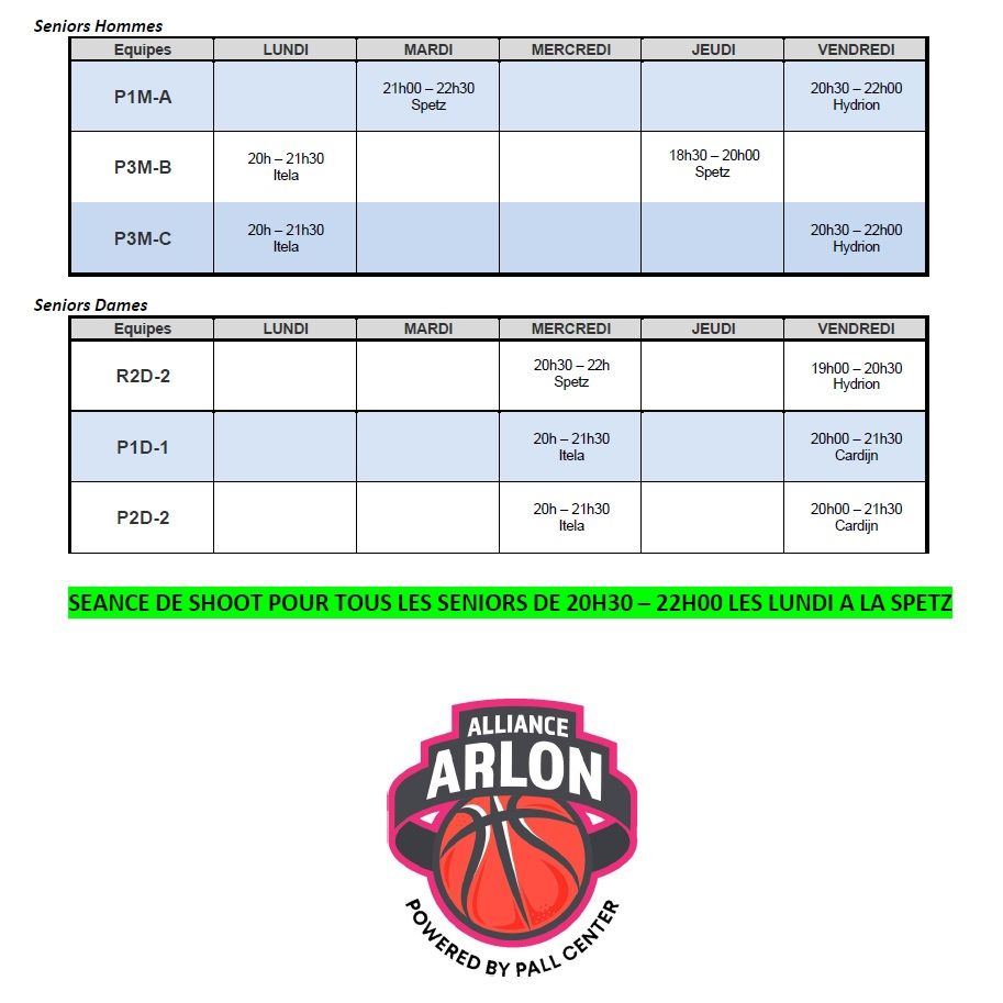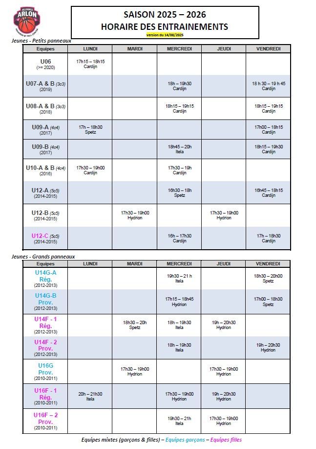 Cliquez ici pour ouvrir le tableau en version pdf reprenant tous les horaires de nos entraînements pour la saison 2025-2026. Ces horaires sont effectifs a partir du 25 août 2025.