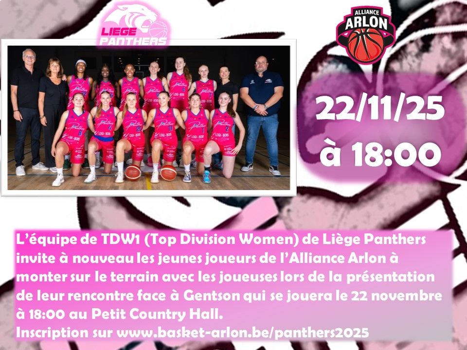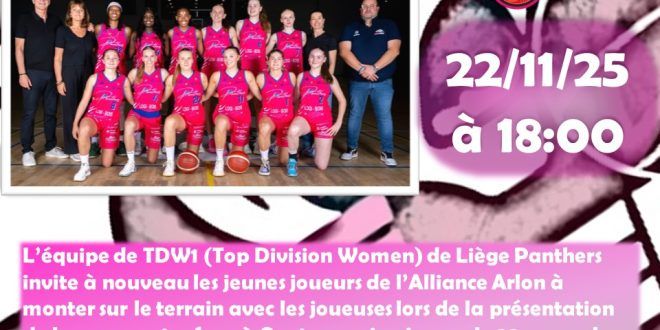 Le club de Liège Panthers invite à nouveau les jeunes joueurs de l’Alliance Arlon à monter sur le terrain avec les joueuses de TDW1 (Top Division Women – 1ère division féminine) lors de la présentation du match contre Gentson qui aura lieu le 22 novembre à Liège à 18:00.